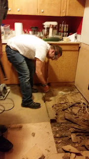 We had some dry rot underneath where the stove and dishwasher were, so we had to cut out the floor and replace it. Thankfully Lynn Dietrick had all the tools that we needed.